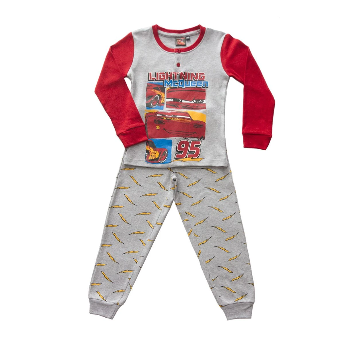 | Dettagli | La confezione contiene un pigiama per bambino composto da: 1 maglia stampata girocollo serafino a due bottoni e polsini elasticizzati 1 pantalone stampato con elastico in vita e polsini elasticizzati Stampa con Saetta McQueen protagonista del movie Cars Dettagli in contrasto di colore Morbido caldo cotone adatto al periodo invernale Prodotto dalla licenziataria ufficiale del marchio |